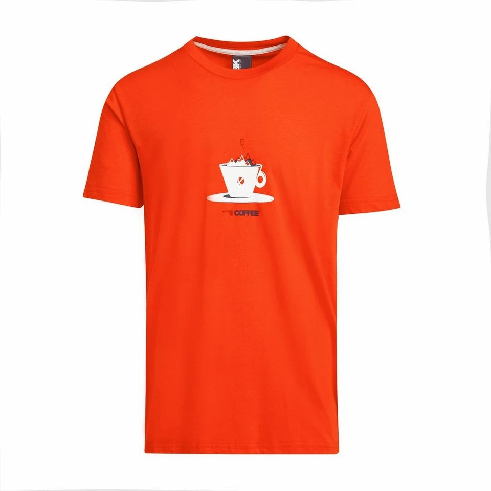 This regular fit climber’s tee features stretchy fabric for when you’re getting active in the mountains. Whimsical “mountains are my coffee” slogan printed on chest.